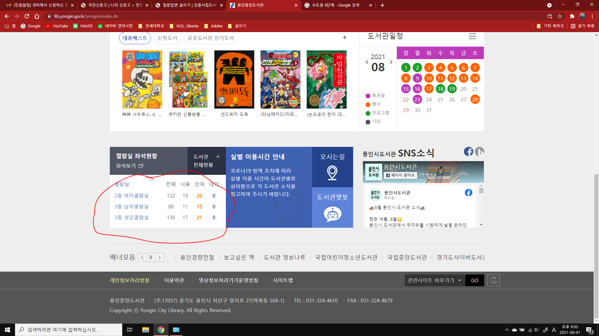 안녕하십니까. 최근 오랫동안 도서관을 사용했는데 최근 코로나 3, 4단계로 인해 도서관 전면 휴관 및 도서예약대출서비스도 중단되었습니다. 코로나 방역수칙 3, 4단계에 의하면 수용인원의 50퍼센트이면 사용가능하다고 했는데 전면적으로 폐쇄하여 사용을 불가능하게 한 것은 불합리하다고 생각하여 건의 드립니다. 50퍼센트 인원제한을 지켜 사용할 수 있도록 부탁 드립니다. 저뿐만 아니라 도서관을 지속적으로 사용해왔던 많은 사람들(도서 열람, 각종 시험 준비등)을 위해서라도 간곡히 부탁 드립니다. 현재 4단계를 유지하는 수도권 도서관(ex 용인시 도서관)을 확인하여 보니(홈페이지) 현재 열람실을 사용하는 것을 확인할 수 있습니다. 3단계인 강릉시립도서관이 전면 휴관을 결정한 것은 4단계인데도 열람실을 운영하는 수도권 도서관과 비교해서 저를 포함한 여러 시민들이 생각할 때 불합리하다고 생각합니다. 관련 민원을 이미 시청에 넣었는데 별로 달라지는 점이 없어서 여기에 글을 작성해보았습니다! 그리고 이 질문에 대한 명료한 답변이 없다면 형평성 문제에 관해 국민신문고 앱으로 적극행정을 신청할 예정입니다.